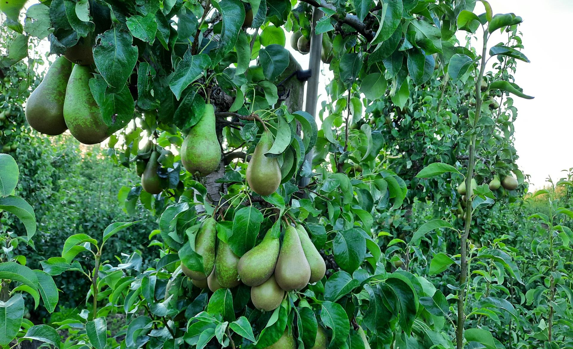Vanaf eind augustus, begin september begint de perenpluk. In de boomgaard worden voornamelijk de peren Conference en Beurré Alexander Lucas geteeld. Conference is een bekende handpeer in Nederland, die veel wordt gegeten. Lucas is een sappige en een wat onbekendere handpeer die voornamelijk in Duitsland wordt geconsumeerd. Daarnaast worden ook de peren Doyenné du Comice en Gieser Wildeman geteeld. Comice is een saprijke en lekkere handpeer die goed smaakt in allerlei gerechten, zoals in een salade. De Gieser Wildeman is de bekende stoofpeer, die lekker zoet is van smaak, zodat je geen suiker hoeft toe te voegen.